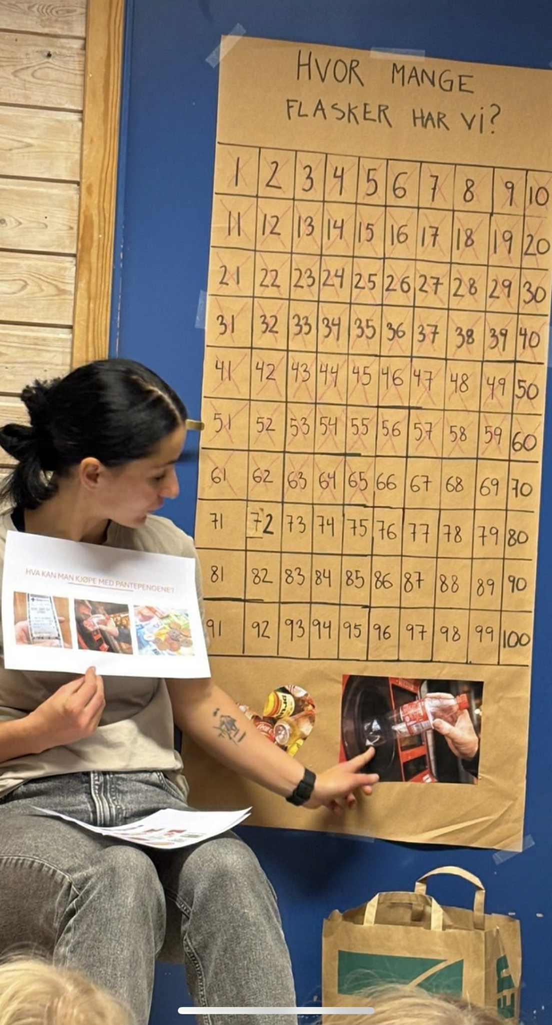 Da avdelingen hadde nådd 500 flasker, begynte de å bla i butikkatalogen for å planlegge handleturen. Barna fikk se gjennom varer, som ble til en handleliste. Deretter trasket de til butikken, og en etter en fikk de matet automatene med flasker.