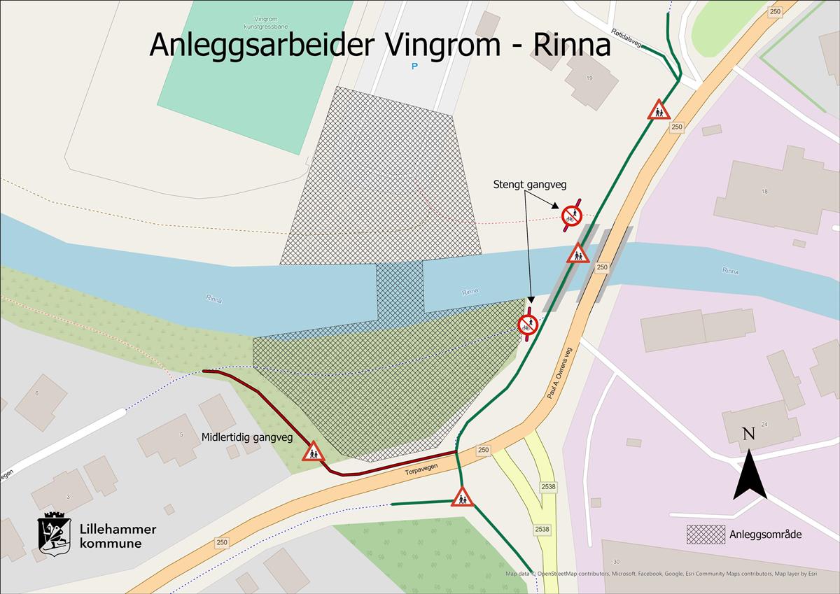 Klikk på kartet for å se større versjon.Fra 16. oktober forbereder vi arbeidet, hvor det blir tilrigging og levering av noe utstyr i nærheten av brua over Rinna. Gangvegen fra Elveskaret skal midlertidig legges om for å ivareta sikkerheten til gående i perioden. Gangvegen langs elva vil bli stengt. Se kart med den midlertidige gangvegen og hvor det blir stengt.